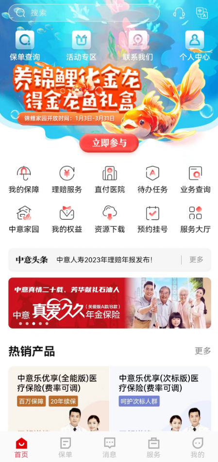 登錄掌上中意,在首頁下方點擊服務(wù)