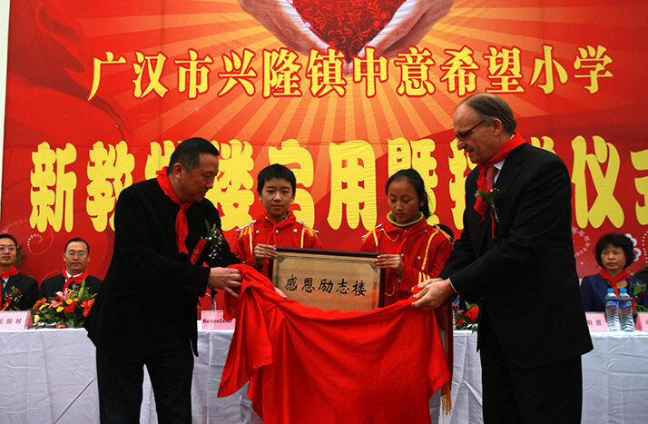 2008年"5.12大地震"發(fā)生后僅兩日,中意人壽即決定以公司名義向中國紅十字會捐款30萬元,幫助災(zāi)區(qū)同胞度過難關(guān)。此外,中意人壽員工也積極響應(yīng),紛紛慷慨解囊,向中國紅十字會捐款21萬余元。后中意人壽又以公司名義捐款50萬元,通過四川省青少年發(fā)展基金會于2009年在四川省廣漢市興隆鎮(zhèn)建設(shè)"中意希望小學(xué)",幫助四川地震災(zāi)區(qū)的孩子們重返校園。