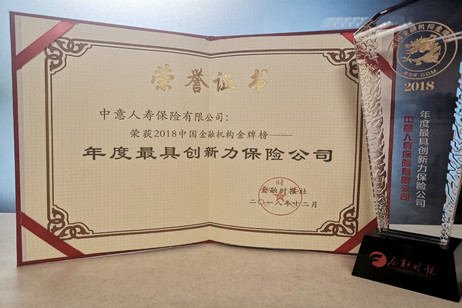 中意人壽在金融時(shí)報(bào)社與中國社會(huì)科學(xué)院金融研究所主辦的“中國金融機(jī)構(gòu)金牌榜●金龍獎(jiǎng)”活動(dòng)中獲得“2018年度最具創(chuàng)新力保險(xiǎn)公司”的殊榮。
