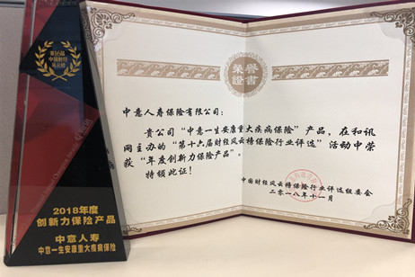 中意人壽“中意一生安康重大疾病保險(xiǎn)產(chǎn)品”在和訊網(wǎng)主辦的“第十六屆財(cái)經(jīng)風(fēng)云榜保險(xiǎn)行業(yè)評選”活動(dòng)中獲得“年度創(chuàng)新力產(chǎn)品“的榮譽(yù)。