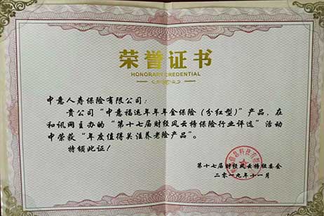 中意福運(yùn)年年年金保險(xiǎn)(分紅型)獲“年度值得關(guān)注養(yǎng)老險(xiǎn)產(chǎn)品”--證書