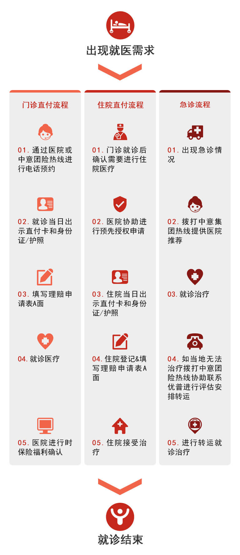 高端醫(yī)療產品依托歐美等發(fā)達國家醫(yī)療體系,就診流程與國內有較大區(qū)別,如就診預約制,住院需要申請預授權,轉診責任制等。中意人壽以客戶便利為優(yōu)先,制定如下建議流程圖供您參考。
