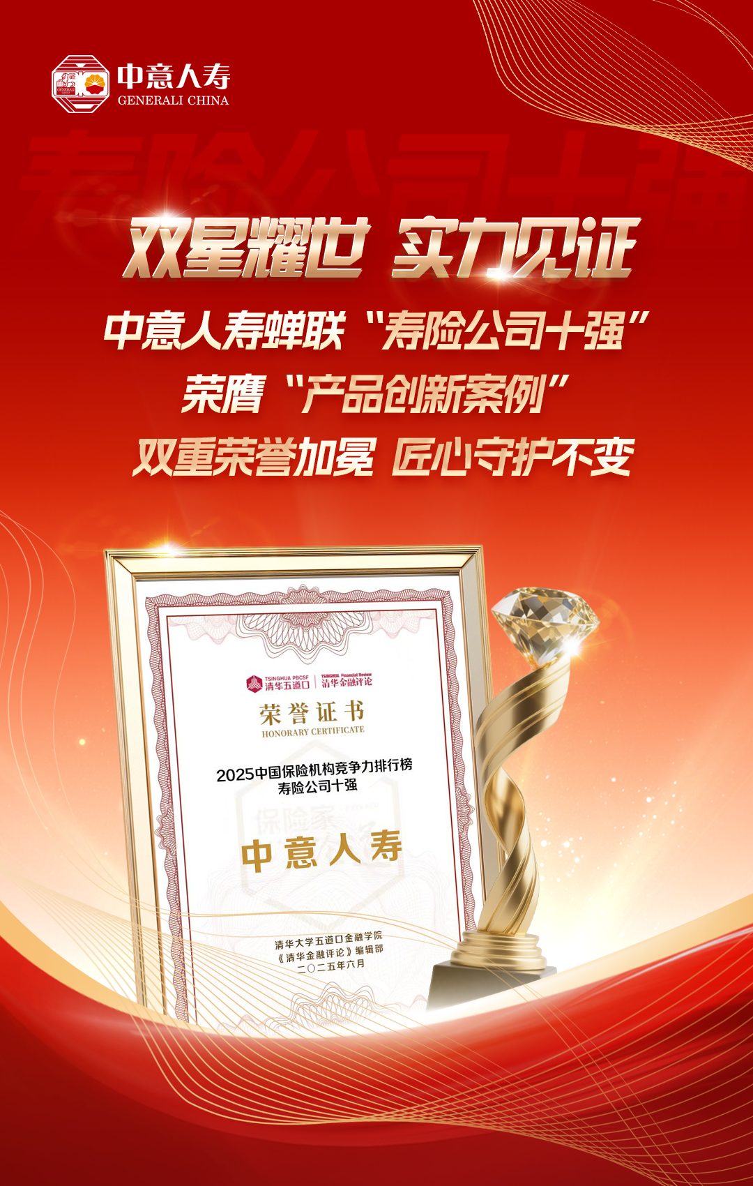 近日,《清華金融評(píng)論》正式發(fā)布《2025中國(guó)保險(xiǎn)競(jìng)爭(zhēng)力研究報(bào)告》,中意人壽保險(xiǎn)有限公司(以下簡(jiǎn)稱“中意人壽”)憑借其不斷攀升的綜合實(shí)力與創(chuàng)新能力,蟬聯(lián)《中國(guó)保險(xiǎn)競(jìng)爭(zhēng)力排行榜》“壽險(xiǎn)公司十強(qiáng)”,并憑借“一生摯愛(ài)”系列產(chǎn)品,獲評(píng)“年度產(chǎn)品創(chuàng)新典型案例”。